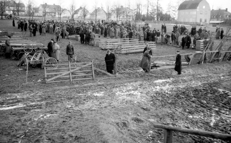 Det är auktion och människor har samlats på en inhägnad lerig gräsplan.