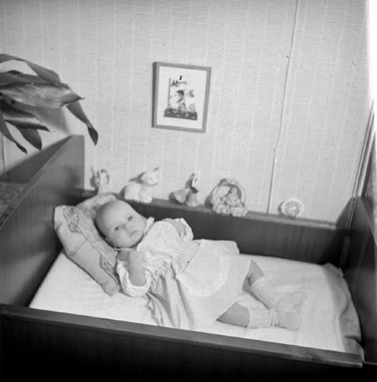 Ett litet barn ligger i en utdragbar barnsäng. På sängkanten står några leksaker och på väggen hänger en tavla med barnmotiv.