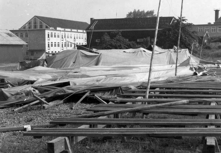 Material finns på plats för uppsättning av tält. I bakgrunden syns Praktiska skolan och Flickskolan i Jönköping.