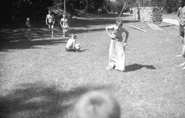 Vuxna och barn har samlats för gemensamma aktiviteter och på gräsmattan tävlar man i säcklöpning.
