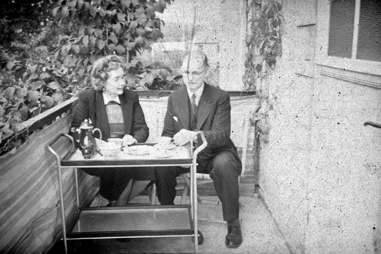 Ett par har tagit med serveringsvagnen ut på sin balkong för en kaffepaus.
