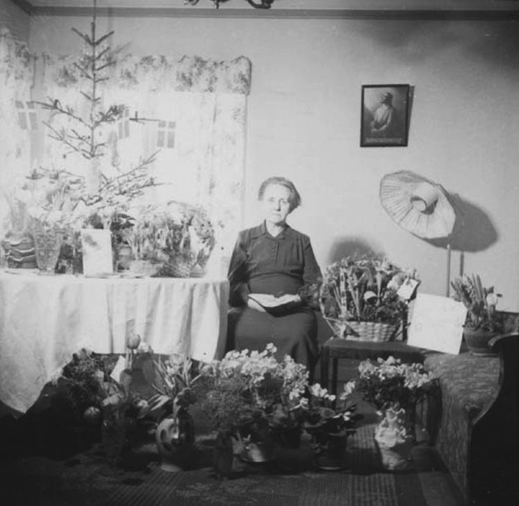 På gratulationskortet till vänster står "Vår hjärtliga lyckönskan på 70 årsdagen 1879-7/1 1949 2.12 92".