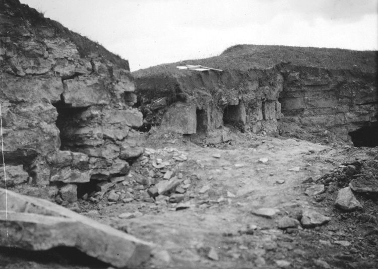 Näs borgruin på Visingsö med mellanrummets norra och östra mur. Porten i mitten rasade under utgrävningen.