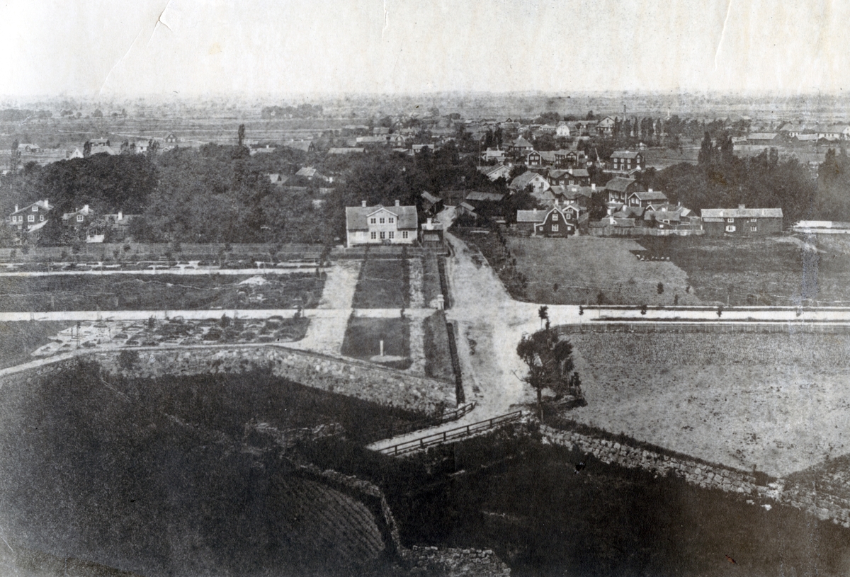 Vy över Gamla staden från Kuretornet på slottet. Södra kyrkogården håller på att anläggas. Den gamla bron leder ännu till slottet. Stadsparken skall inte anläggas ännu på nästan tio år. Det ljusa huset mitt i bild står ännu, liksom ett rött till höger. Annars är bilden förändrad. På den öppna ytan till höger, p andra sidan gatan från där parken anlades, byggdes stadens lasarett 1878. Det är nu, 2021, bostäder efter att en längre tid varit skola. Längre bort breder idag bostäder ut sig.