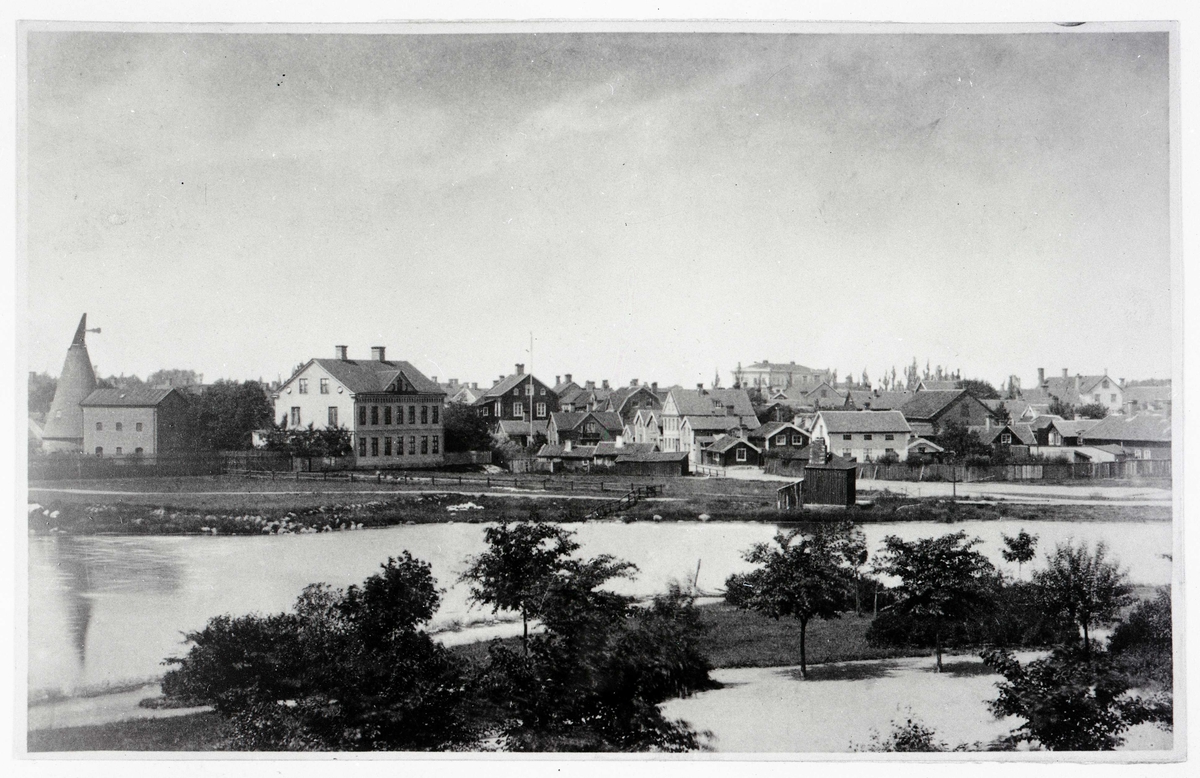 Den så kallade "Betäckta vägen", nuvarande Sveaplan, omkring 1880. Längst till vänster det Forssellska bryggeriet och dess runda torkhus.