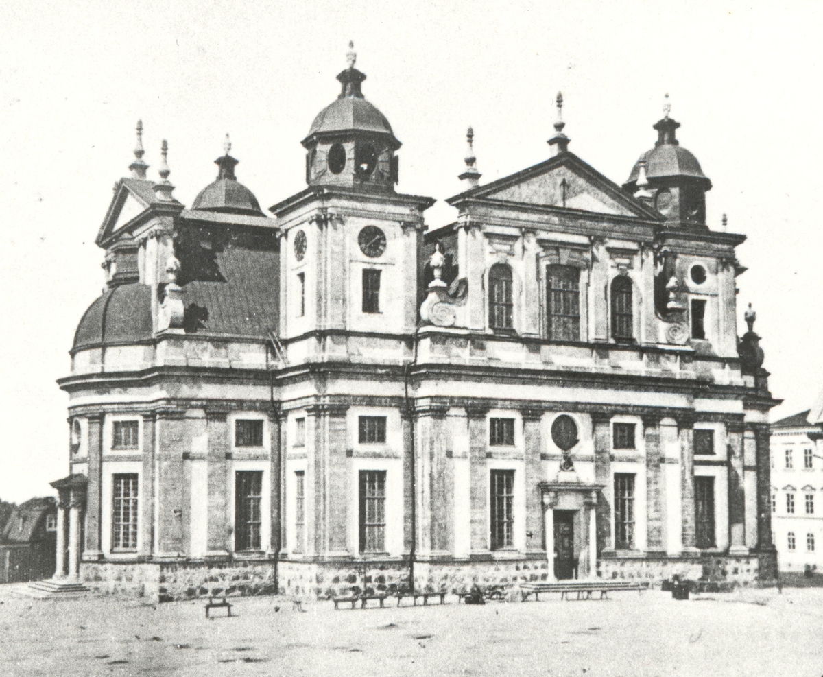 Kalmar Domkyrka. Barockstil. Ritad av Nikodemus Tessin d.ä. Sydvästra fasaden. Lagningsbruk som täcker infästningsjärnet är synligt i tofsens mitt.