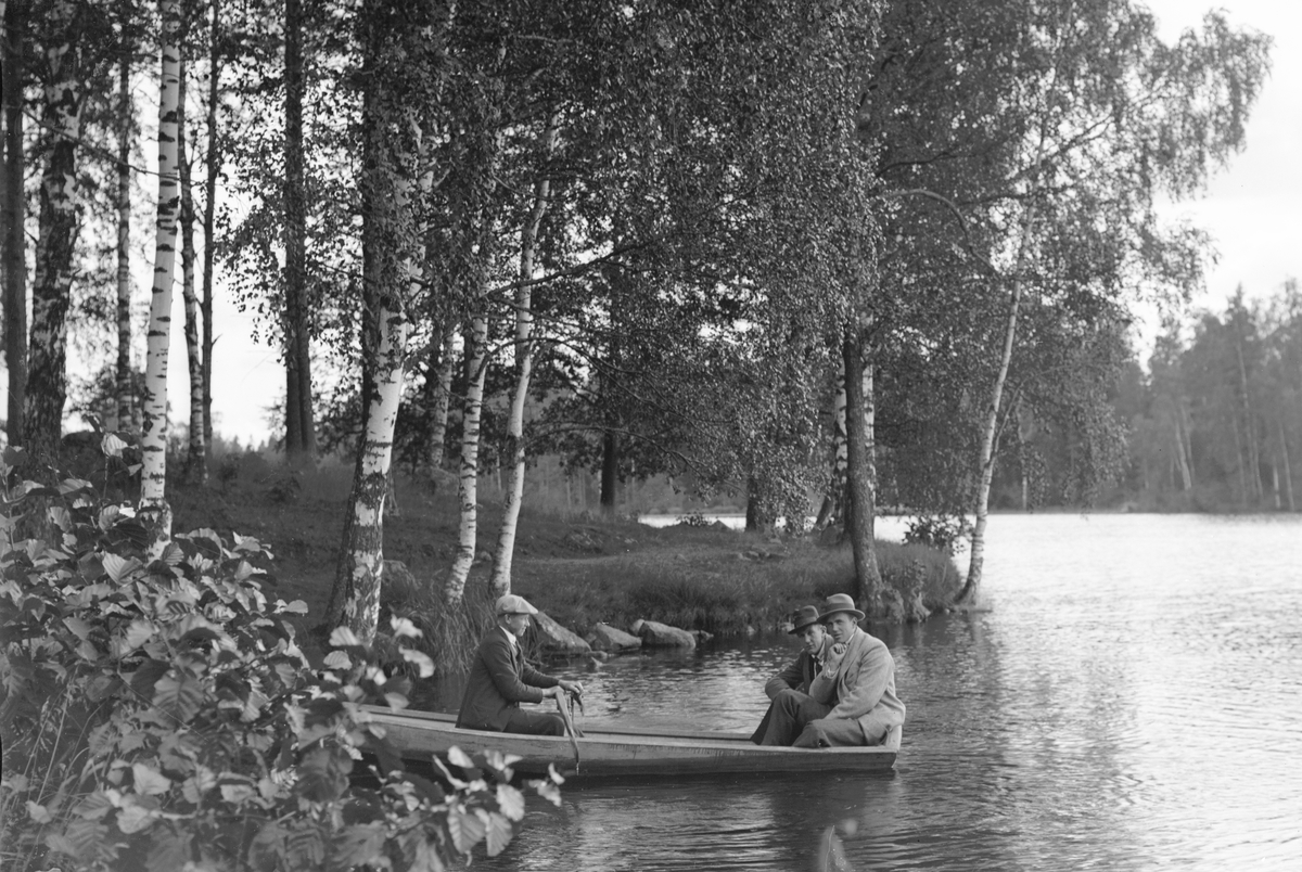 Nedre dammen i Gammelstilla. Vid årorna Gustav Englund, Prästhyttan och i aktern sittandes till höger Einar Larsson.