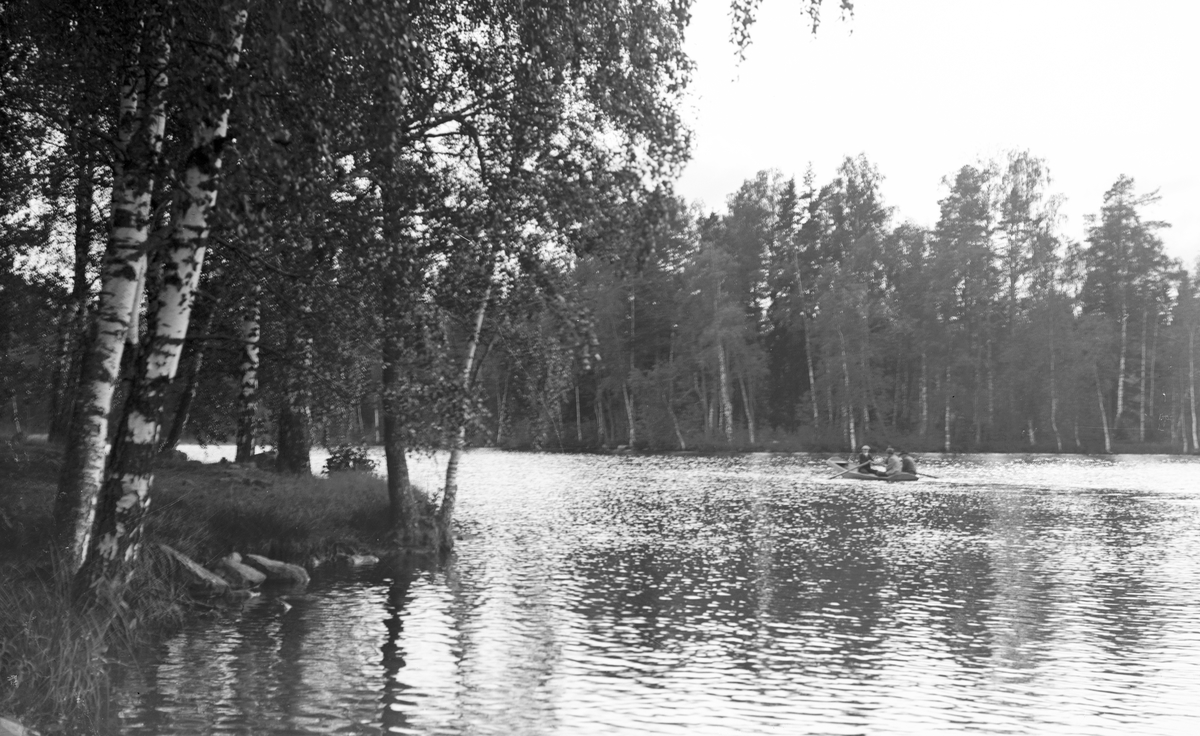 Nedre dammen i Gammelstilla. Vid årorna Gustav Englund, Prästhyttan och i aktern sittandes till höger Einar Larsson.