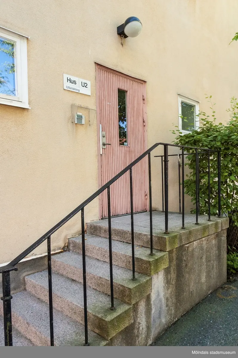 Yttertrappa och entré till byggnad U2 tillhörande Mölndals sjukhus i Bosgården, Mölndal. Fotografi taget den 10 juni 2014. Byggnadsdokumentation inför rivning.