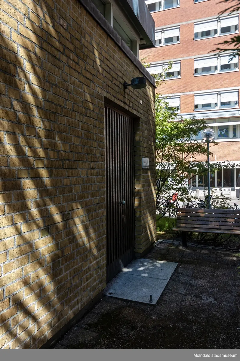Byggnad X i gult tegel, tillhörande Mölndals sjukhus i Bosgården, Mölndal. Entrédörr i brunt trä ses på den östra fasaden. Fotografi taget den 10 juni 2014. Byggnadsdokumentation inför rivning.