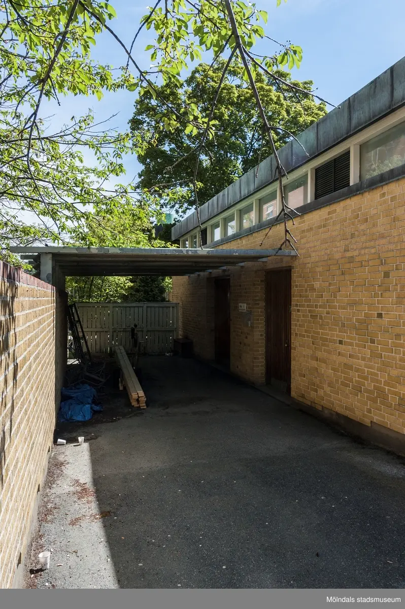 Lastplats under tak med entréer till byggnad X, i gult tegel, tillhörande Mölndals sjukhus i Bosgården, Mölndal. Fasaden vetter mot norr. Fotografi taget den 10 juni 2014. Byggnadsdokumentation inför rivning.