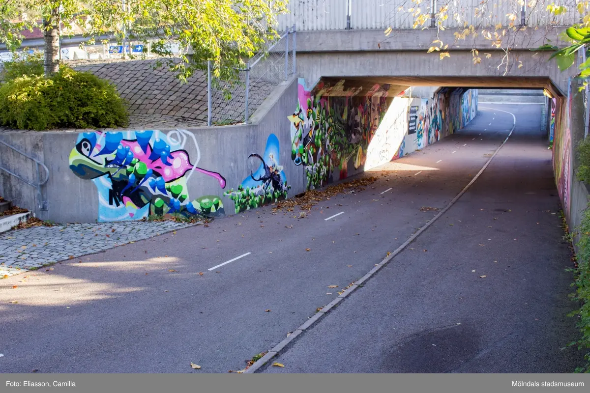 Tunnel med gång- och cykelbana i anslutning till Kållereds station. Målningar pryder tunnelns väggar. Fotografi taget den 6 oktober 2016.