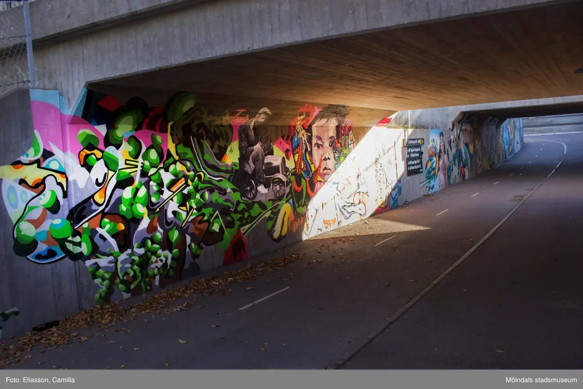 Tunnel med gång- och cykelbana i anslutning till Kållereds station. Målningar pryder tunnelns väggar. Fotografi taget den 6 oktober 2016.
