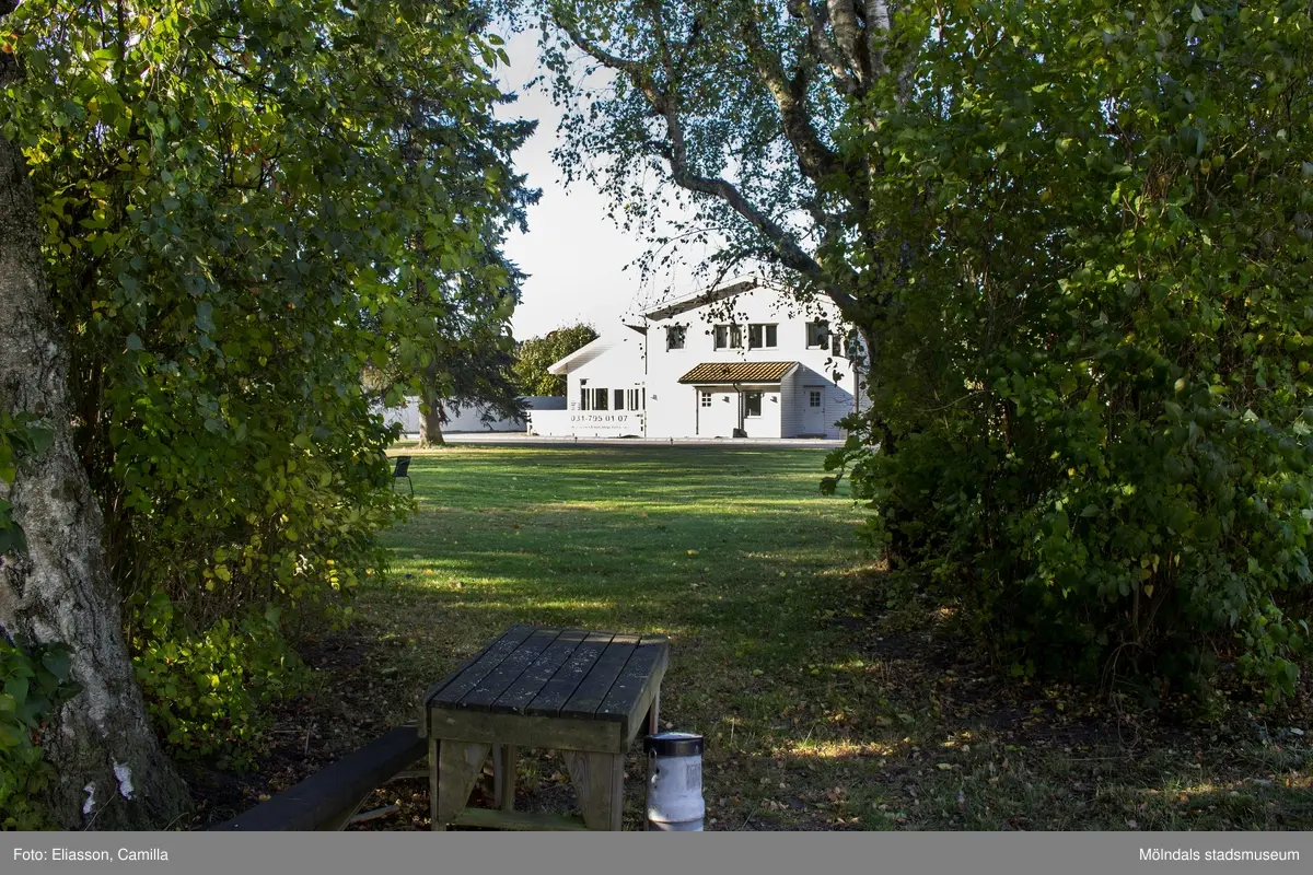 Genom grönskan skymtas huset Gamla Riksvägen 54 i Kållereds centrum den 6 oktober 2016. Byggnaden inrymmer Restaurang Perla.