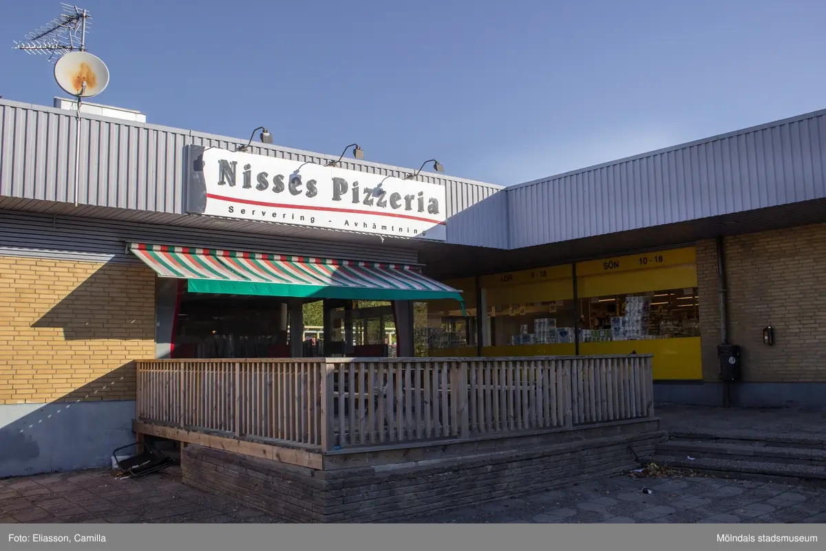Nisses Pizzeria vid torget i Kållereds centrum den 6 oktober 2016. Fönster och uteservering mot söder.