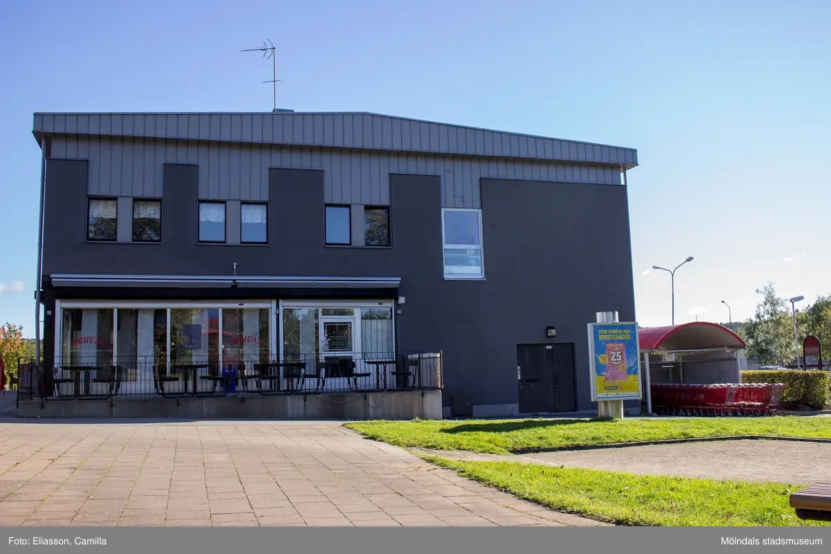 Västra gaveln till byggnaden Almåsgången 1 i Lindome centrum, den 4 oktober 2016. I gatuplanet ses Druvan Pizzeria.
