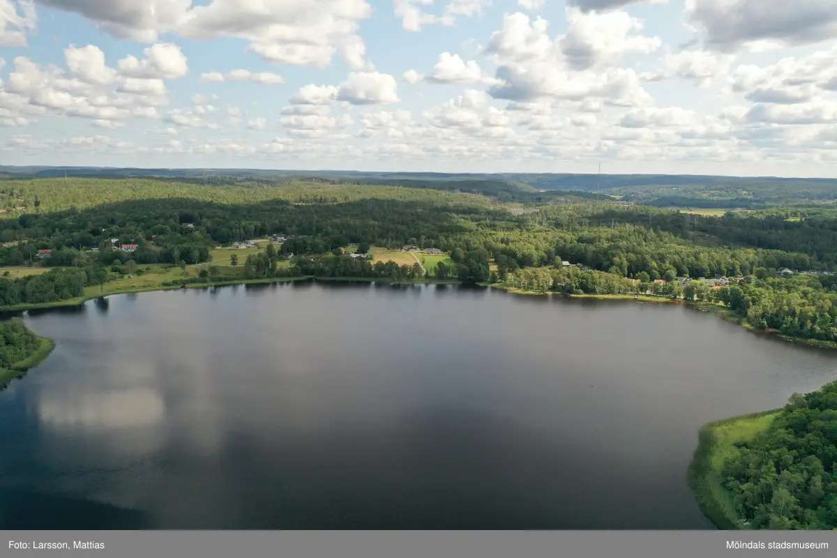 Flygfotografi över Tulebosjön mot Tulebo. Vy i riktning österut från Stretered, Kållered, i Mölndals kommun. Fotografi taget av Mattias Larsson, Borohus AB, den 23 augusti 2021.