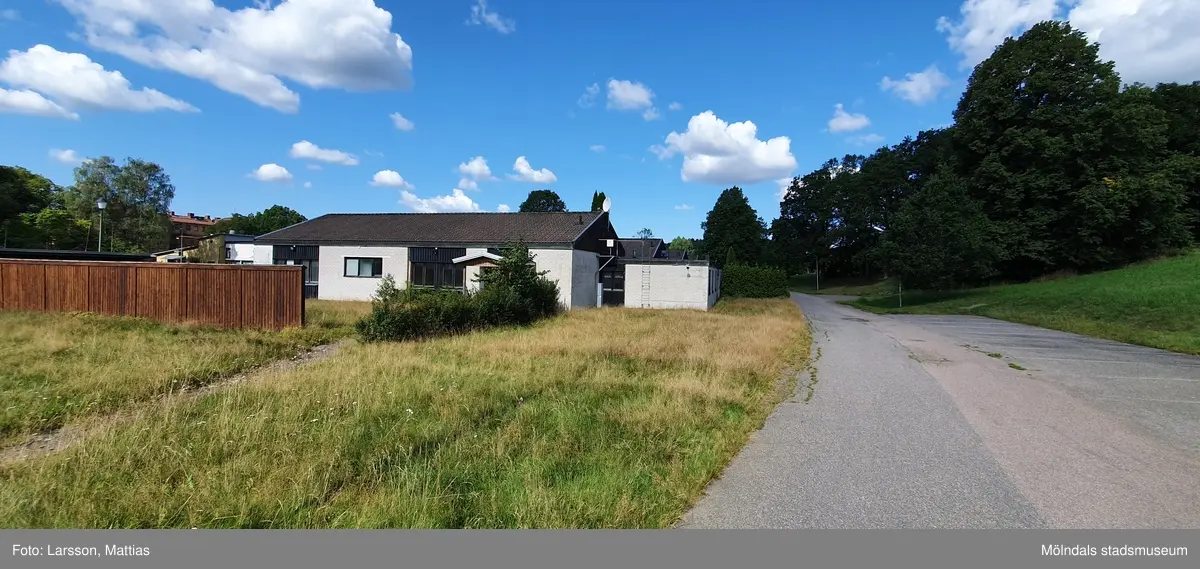 Fotografi som visar del av kamhuset Änggården, Stretered 1:106, med gatuadress Ängbackevägen 21-27 i Stretered, Kållered, i Mölndals kommun. Vy mot nordväst. Byggnadsdokumentation inför rivning. Fotografi taget av Mattias Larsson, Borohus AB, den 23 augusti 2021.