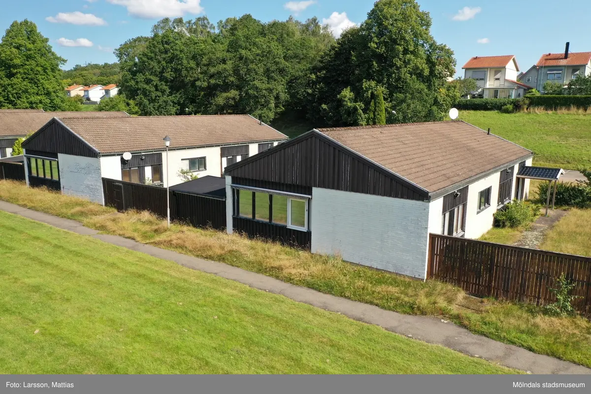 Flygfotografi som visar bebyggelse i Stretered, Kållered, i Mölndals kommun. Vy mot nordost. Närmast ses del av kamhuset Änggården, Stretered 1:106, med gatuadress Ängbackevägen 21-27. I bakgrunden skymtas nyare bostadsbebyggelse vid samma gata. Byggnadsdokumentation inför rivning. Fotografi taget av Mattias Larsson, Borohus AB, den 23 augusti 2021.