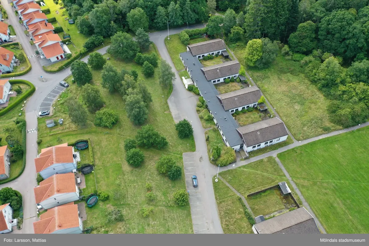 Flygfotografi som visar bebyggelse i Stretered, Kållered, i Mölndals kommun. Vy mot sydost. Till höger ses kamhuset Backegården, Stretered 1:106, med gatuadress Ängbackevägen 13-19. Till vänster ses nyare bostadsbebyggelse vid samma gata. Byggnadsdokumentation inför rivning. Fotografi taget av Mattias Larsson, Borohus AB, den 23 augusti 2021.