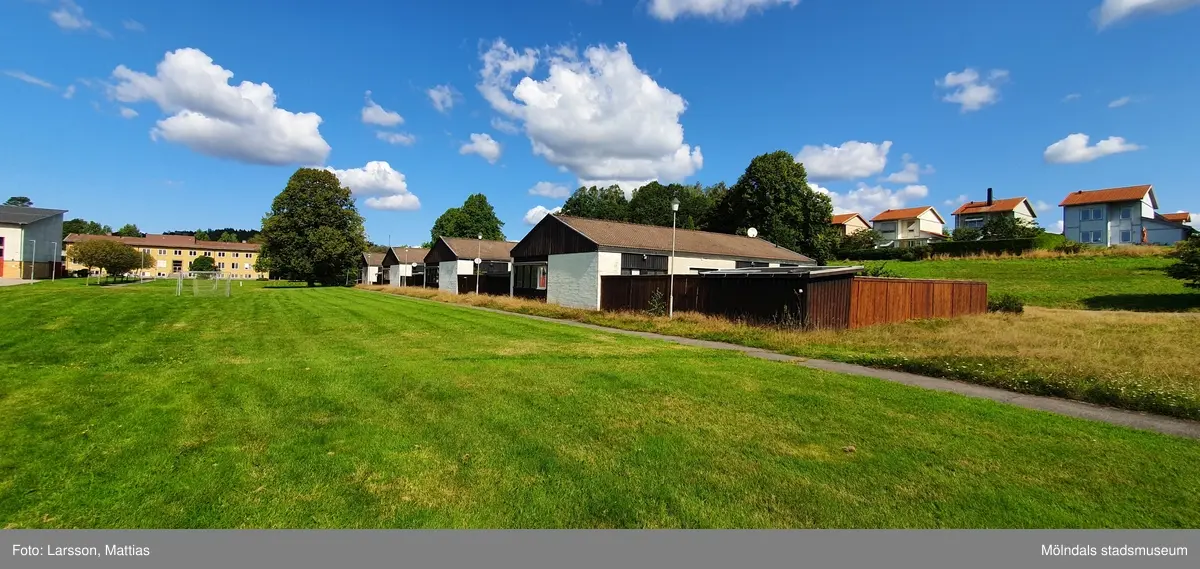 Fotografi som visar kamhuset Änggården, Stretered 1:106, med gatuadress Ängbackevägen 21-27 i Stretered, Kållered, i Mölndals kommun. Vy mot sydväst. Framför huset går en asfalterad, upplyst gångväg. Byggnadsdokumentation inför rivning. Fotografi taget av Mattias Larsson, Borohus AB, den 23 augusti 2021.