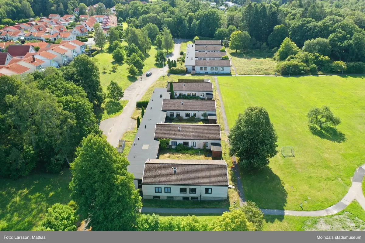 Flygfotografi som visar bebyggelse i Stretered, Kållered, i Mölndals kommun. Vy mot sydost. Närmast ses kamhusen Änggården och Backegården, Stretered 1:106, med gatuadresser Ängbackevägen 21-27 och 13-19. Byggnadsdokumentation inför rivning. Fotografi taget av Mattias Larsson, Borohus AB, den 23 augusti 2021.