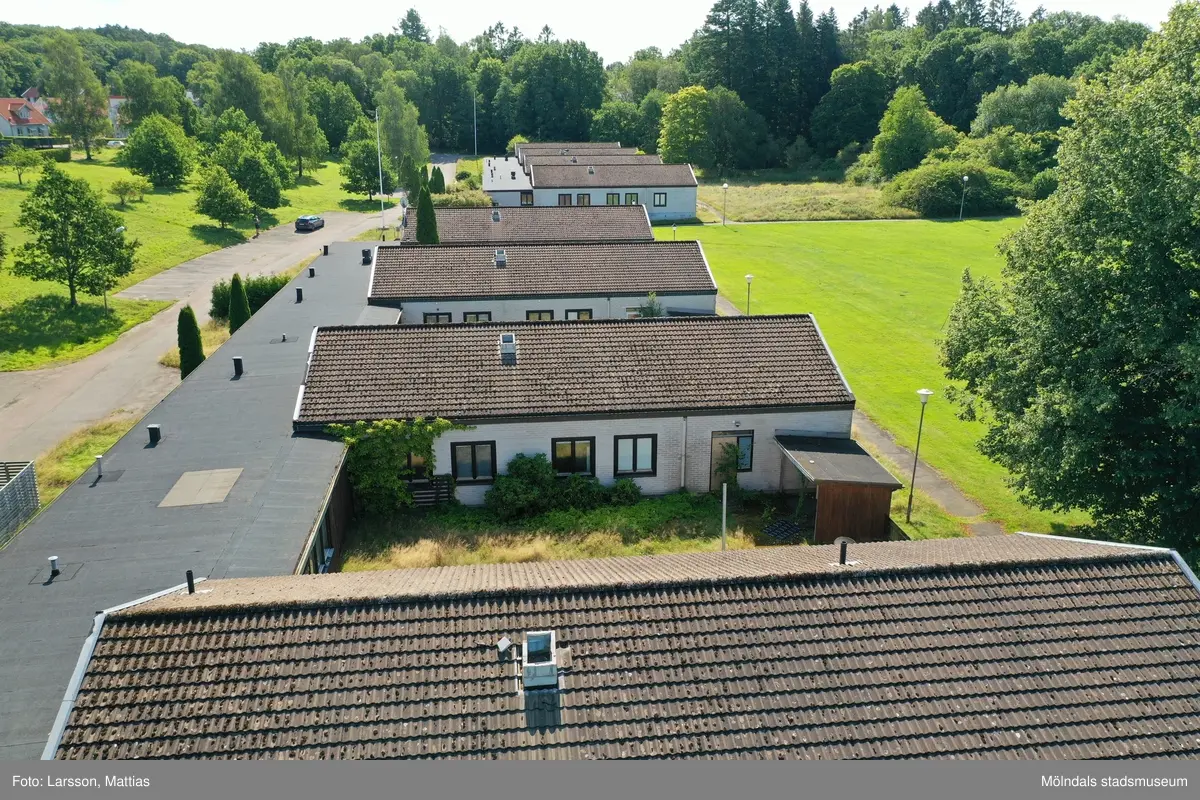 Flygfotografi som visar bebyggelse i Stretered, Kållered, i Mölndals kommun. Vy mot sydost. Närmast ses kamhusen Änggården och Backegården, Stretered 1:106, med gatuadresser Ängbackevägen 21-27 och 13-19. Byggnadsdokumentation inför rivning. Fotografi taget av Mattias Larsson, Borohus AB, den 23 augusti 2021.