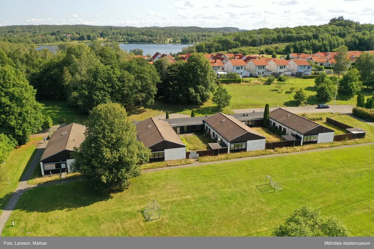 Flygfotografi som visar bebyggelse i Stretered, Kållered, i Mölndals kommun. Vy mot öster. Närmast ses kamhuset Änggården, Stretered 1:106, med gatuadress Ängbackevägen 21-27. I bakgrunden ses nyare bostadsbebyggelse vid samma gata samt Tulebosjön. Byggnadsdokumentation inför rivning. Fotografi taget av Mattias Larsson, Borohus AB, den 23 augusti 2021.