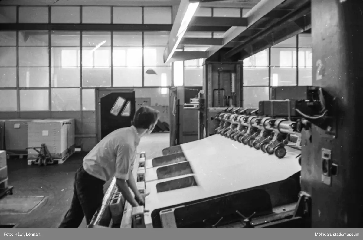 Man i arbete vid maskin på pappersbruket Papyrus i Mölndal, hösten 1970.