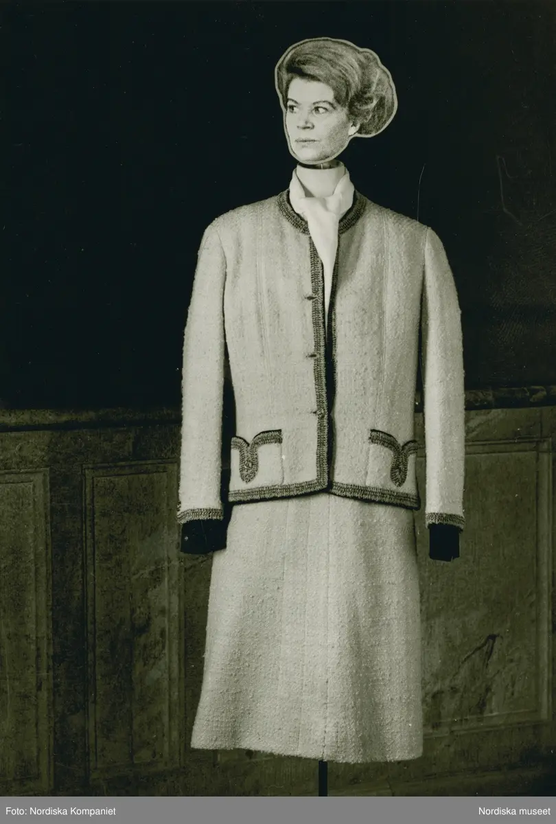 Astrid Sampe i dräkt från Chanel. Dräkt på provdocka, fotomontage med huvud.