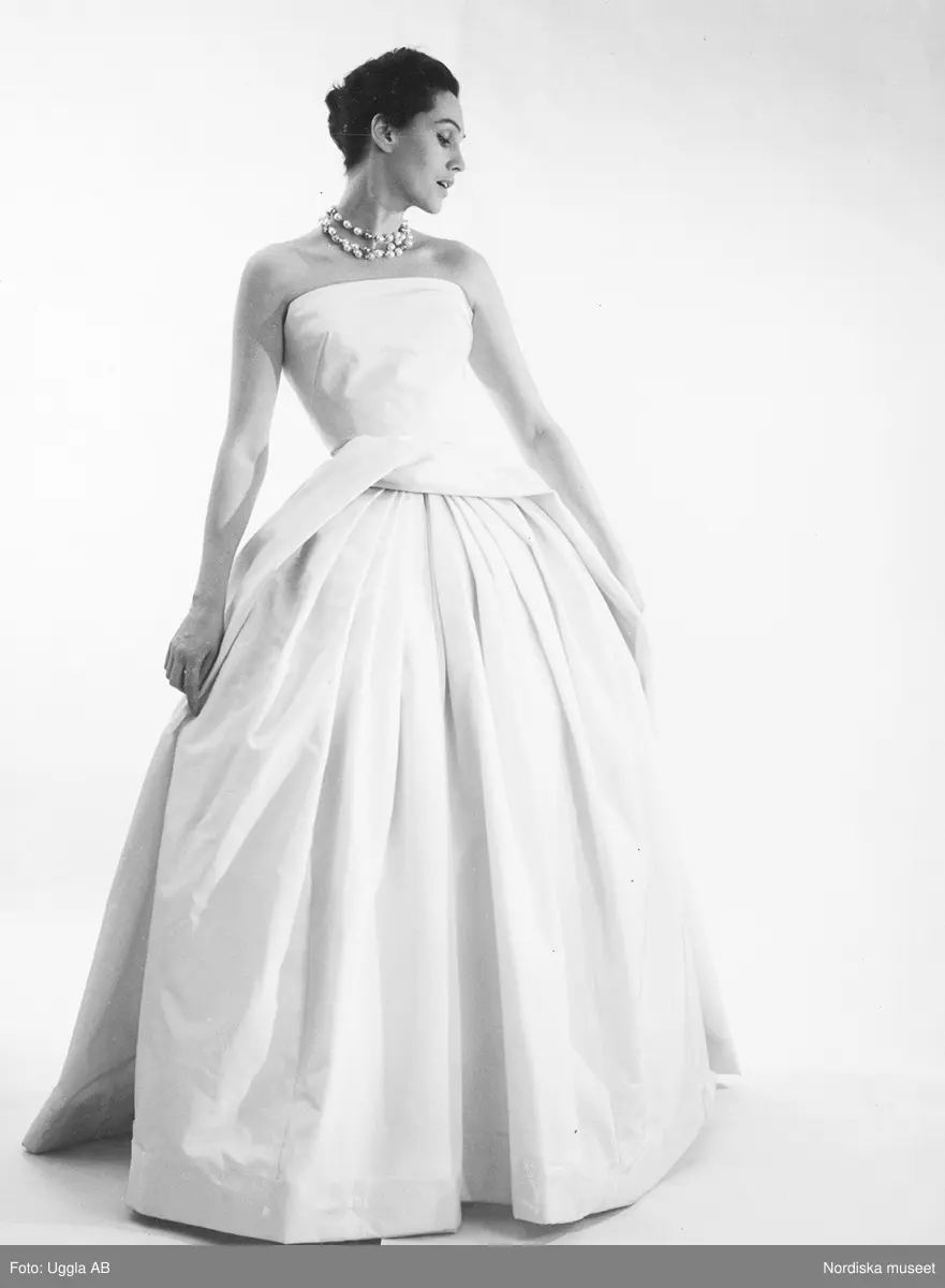 Mannekäng i vit aftonklänning i vit faille från NK:s Franska. Original Jeanne Lafaurie, NK:s Franska damskrädderi.