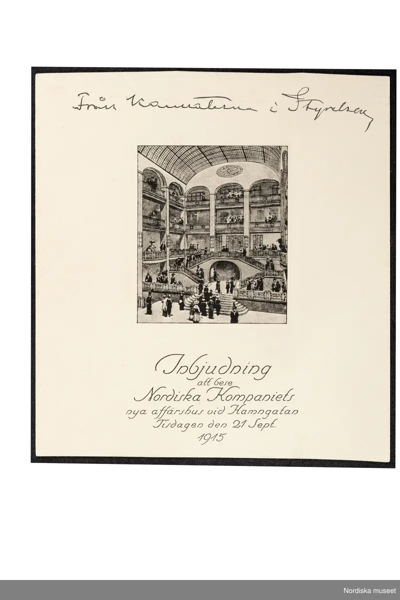 Inbjudningskort till invigningen av Nordiska Kompaniets (NK) nya affärshus vid Hamngatan i Stockholm tisdagen den 21 september 1915. Handskrift "Från kamraterna i Styrelsen" på framsidan.