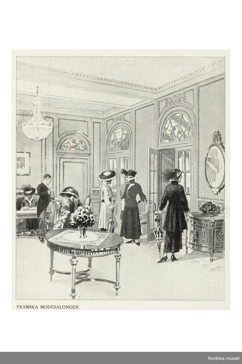 Interiör från salongen på NK:s Franska damskrädderi, Nordiska Kompaniet på Hamngatan i Stockholm. Illustrationen finns på sidan 17 i varuhusets lanseringsbroschyr från 1915 och visar kvinnliga kunder som samtalar, tittar i katalog och ser på tyg. Teckningen utförd av Victor Andrén.