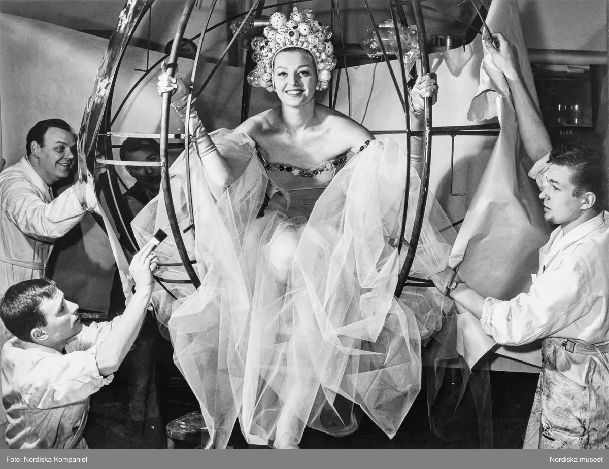 Operamaskeraden. Kvinna utklädd med peruk av kulor och dräkt med vida ärmar av tyll sitter i metallkonstruktion, delvis inklädd i skyddspapper. Tre män i vita rockar assisterar henne.