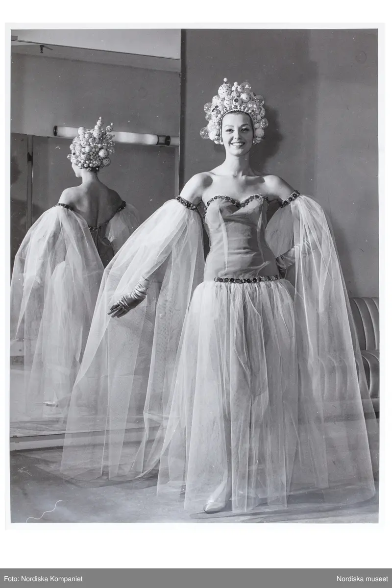 Operamaskeraden. Kvinna står framför spegel i provrum på varuhuset Nordiska Kompaniet. Hon bär peruk av kulor och maskeraddräkt med baddräktsliv, tyllkjol och tyllärmar.