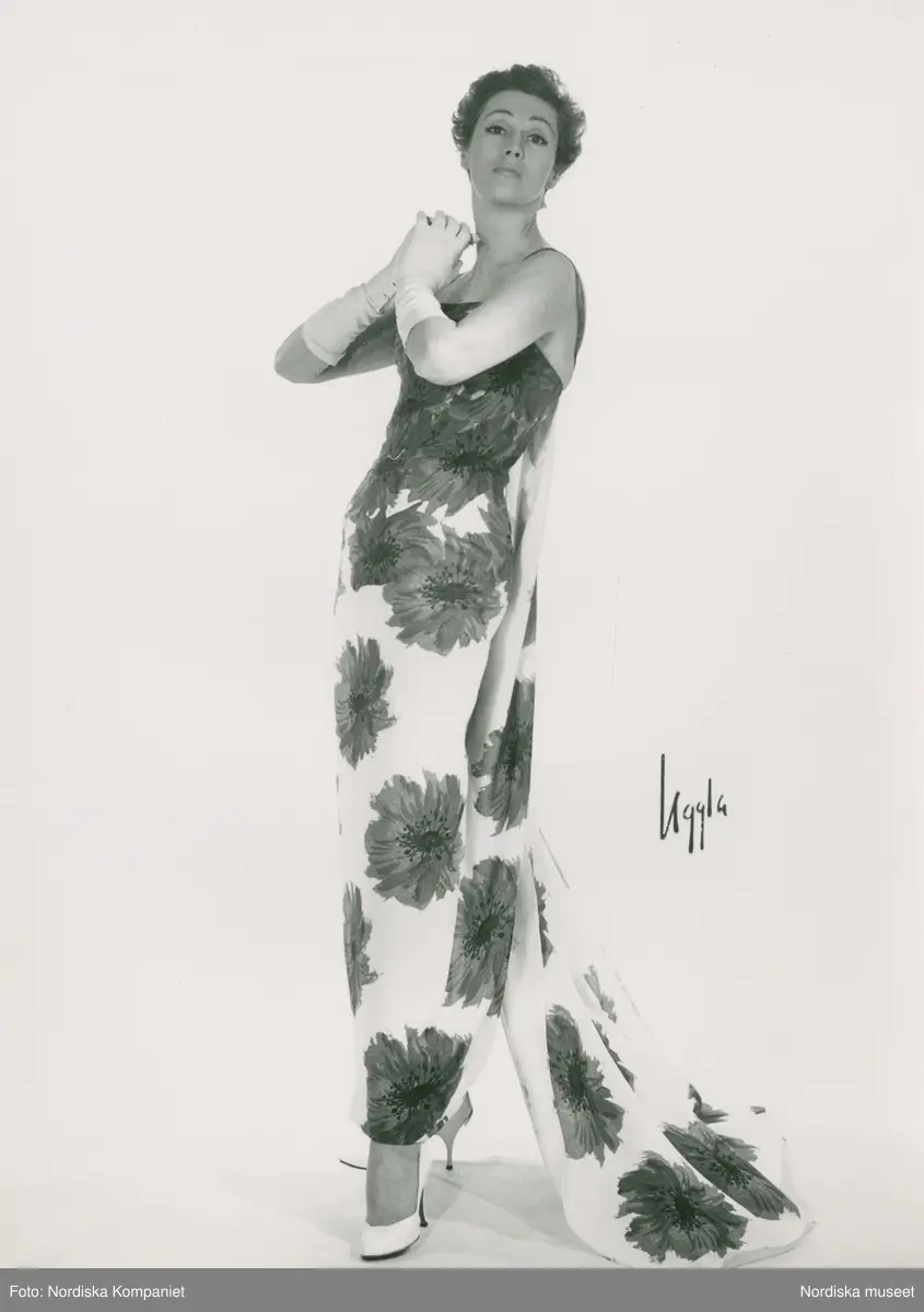 Mannekäng i mönstrad långklänning, handskar och pumps. Original från Balmain, NK:s Franska damskrädderi.
