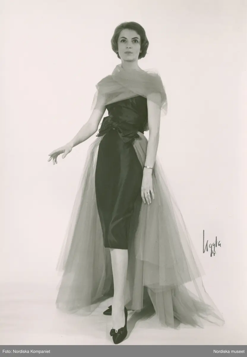 Mannekäng i klänning och lång sjal i tyll. NK:s Franska damskrädderi, våren 1958.