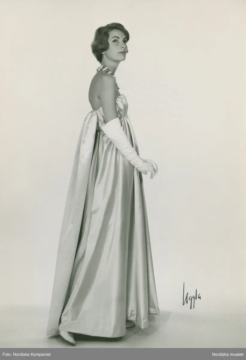 Mannekäng i hellång aftonklänning i ljusblå satin, operahandskar och halsband. Original - Balenciaga, NK:s Franska damskrädderi.