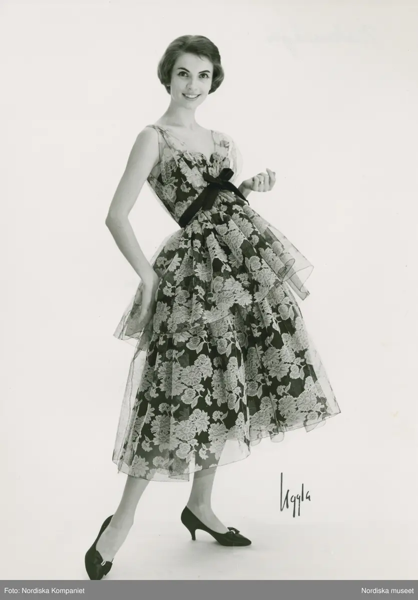 Mannekäng i mönstrad klänning i etapper med rosett, samt pumps. Balenciaga, NK:s Franska damskrädderi.