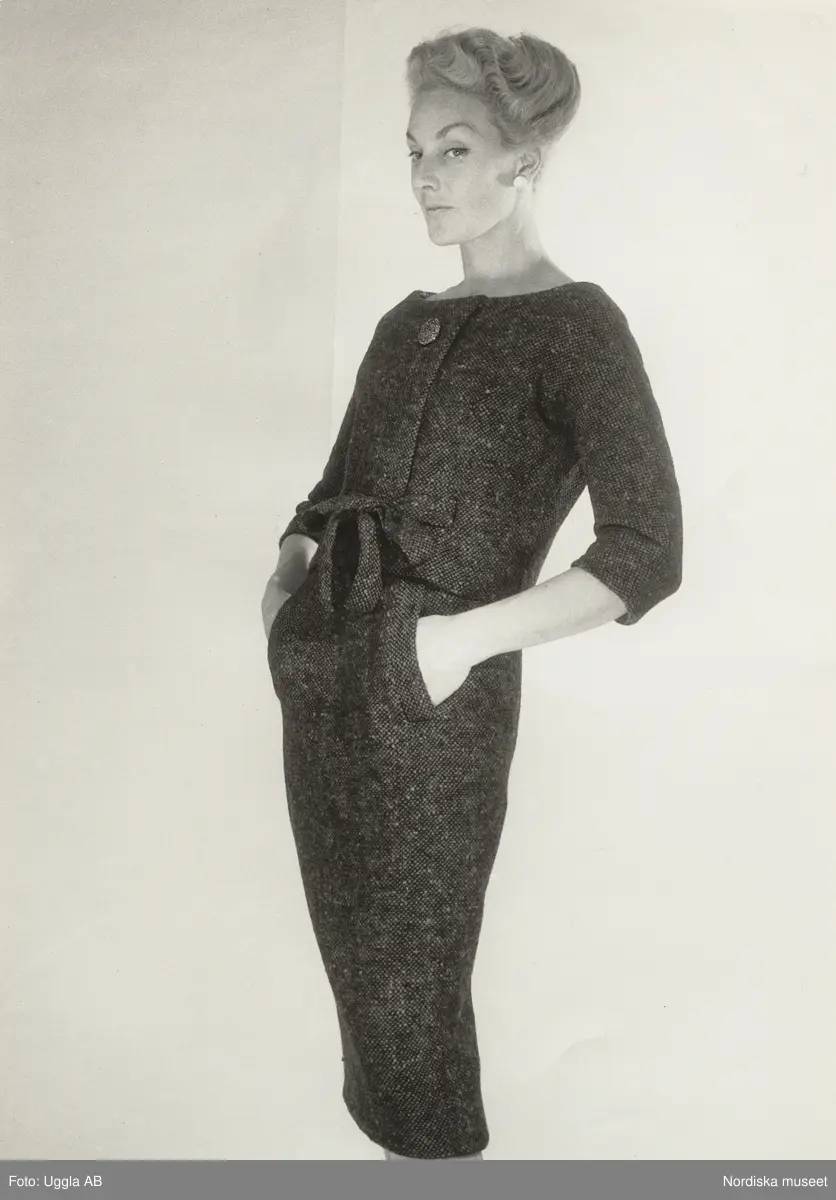 Mannekäng i brun och svart tweedklänning med rosett framtill. Från Dior, NK:s Franska damskrädderi.