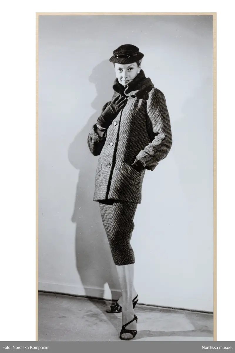 Mannekäng visar höstplagg i provrummet vid NK:s Franska damskrädderi. Dräkt av tweed med stusslång rak jacka, knäppning fram, stor ståkrage och snedfickor. Vadlång rak kjol. Hatt, handskar och remsandaletter av slingbackmodell.