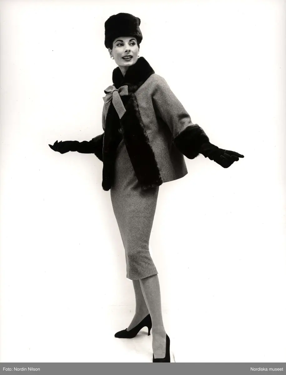 Dammode, Givenchy på NK:s Franska damskrädderi i Stockholm. Mannekängen Erika Sundt i dräkt med pälskant och pälshatt, handskar.