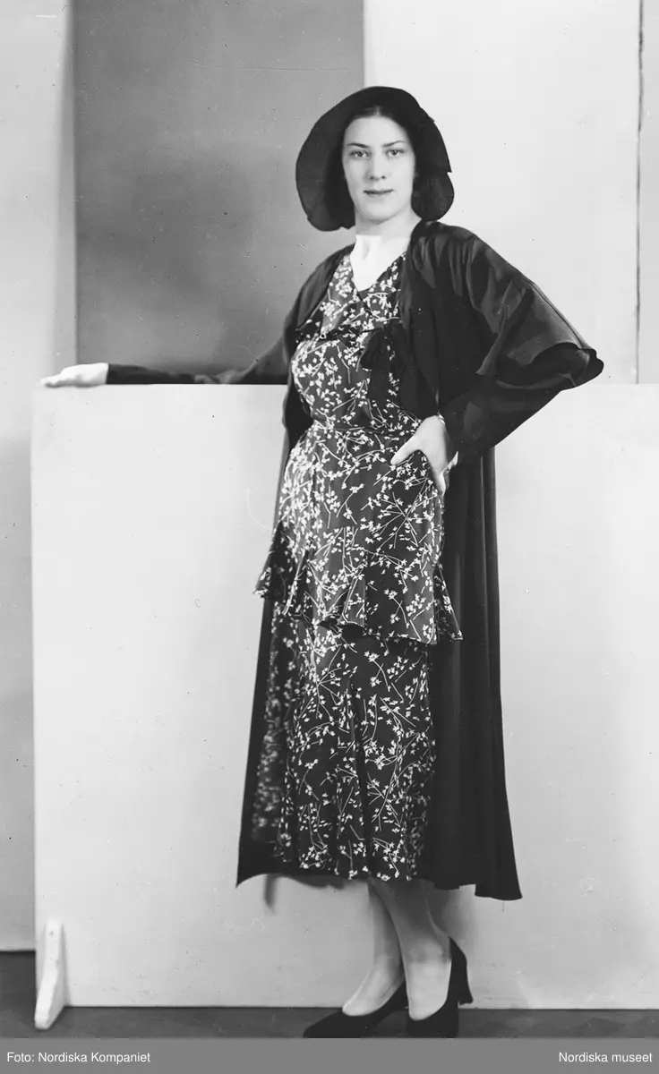 Modell i mönstrad klänning, svart kappa, slokhatt och pumps.