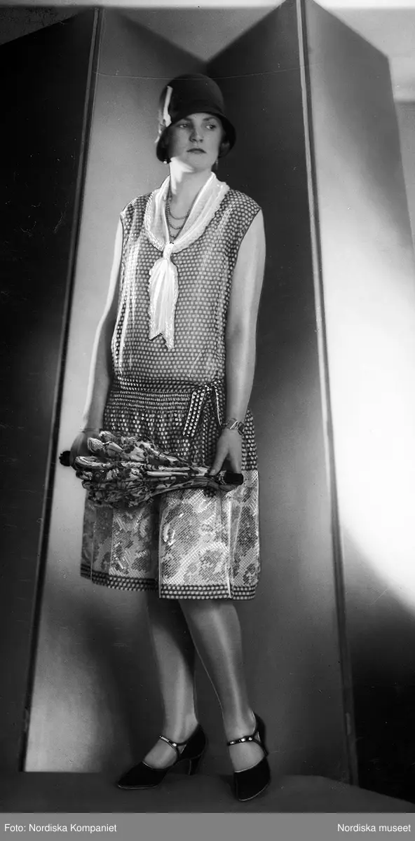 Modell i mönstrad klänning med vit sjal, klockhatt och paraply i handen.