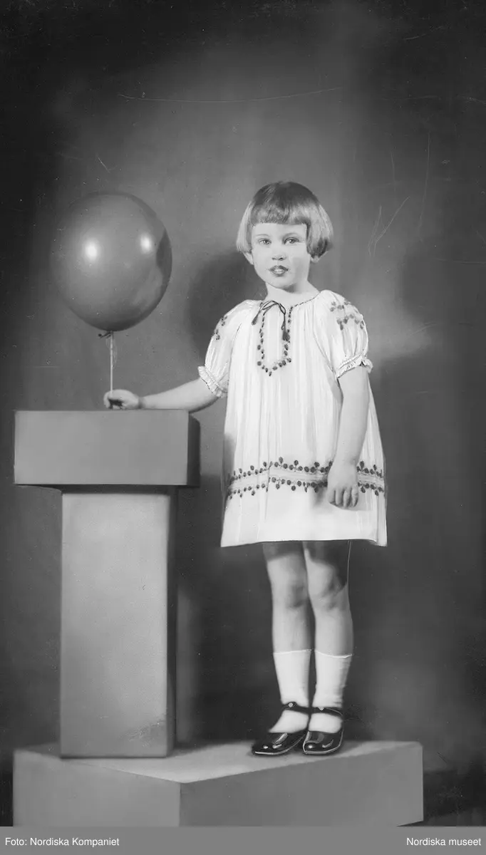 Flicka i vit klänning med brodyr och puffärmar, vita strumpor och lackskor, håller i ballong.
