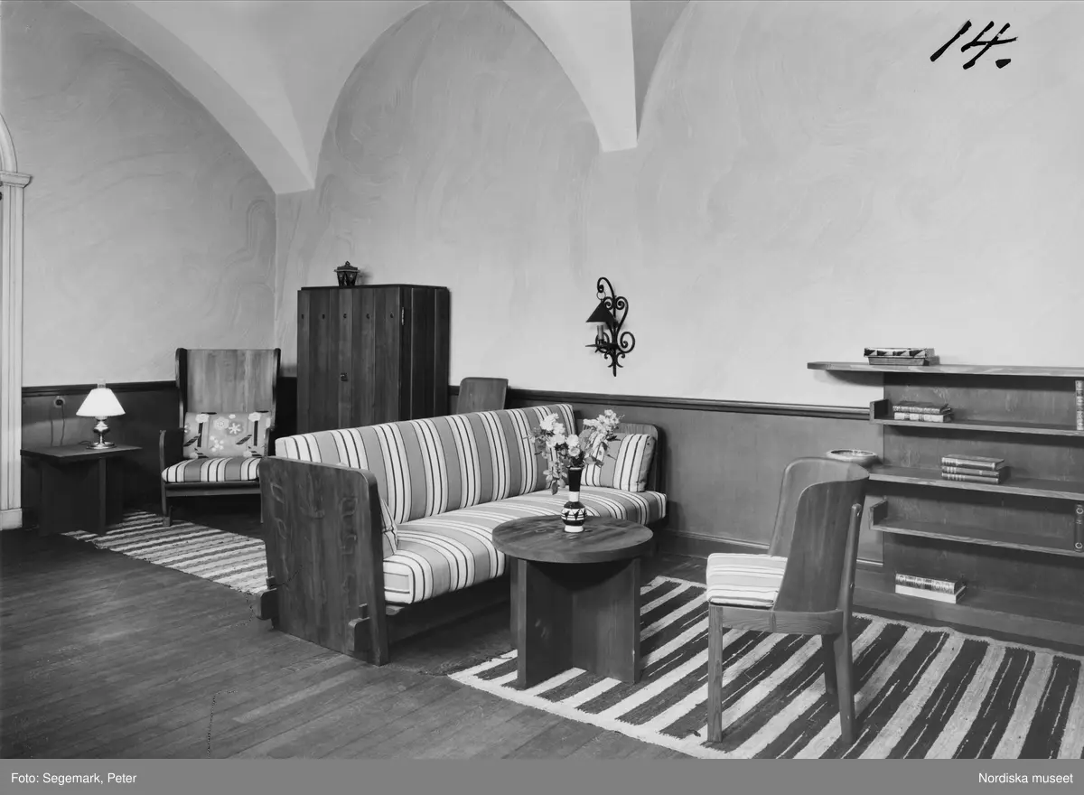 Vardagsrum, interiör, randig soffa, runt bord, randig matta. Nordiska kompaniet.