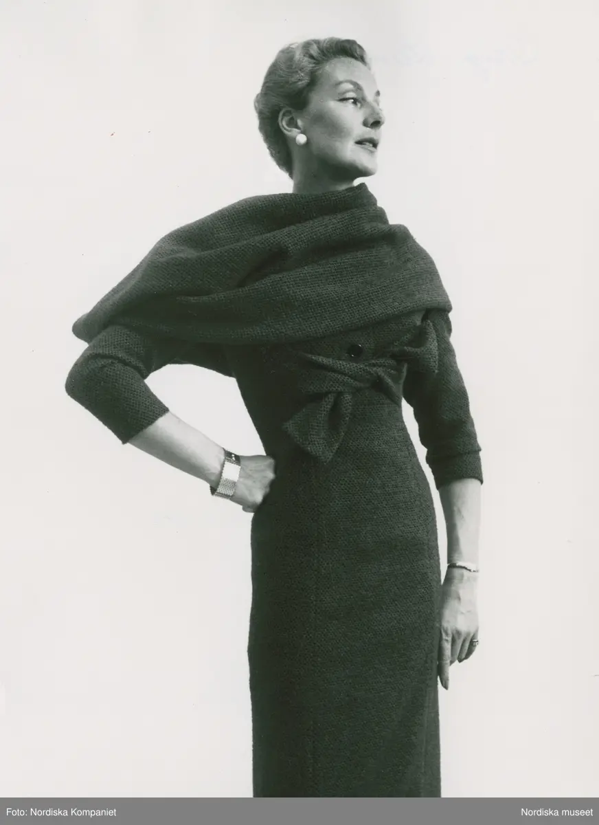Mannekängen Margareta Berglund i klänning med sjal och knutet band, armband, ring och örhänge. Original från Lanvin, NK:s Franska damskrädderi.