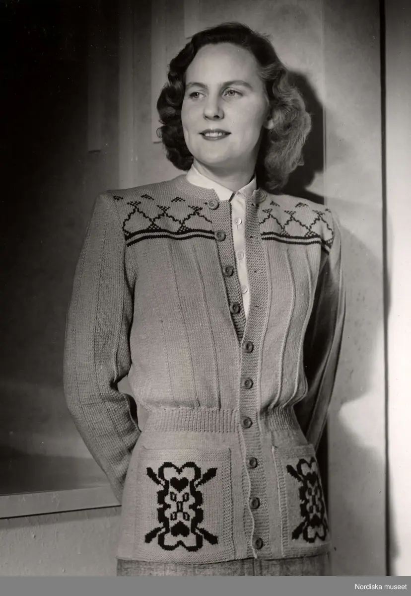 Dammode visas på varuhuset Nordiska Kompaniet i Stockholm vintern 1944. En kvinnlig modell poserar iklädd mönsterstickad knäppt tröja, blus och kjol.