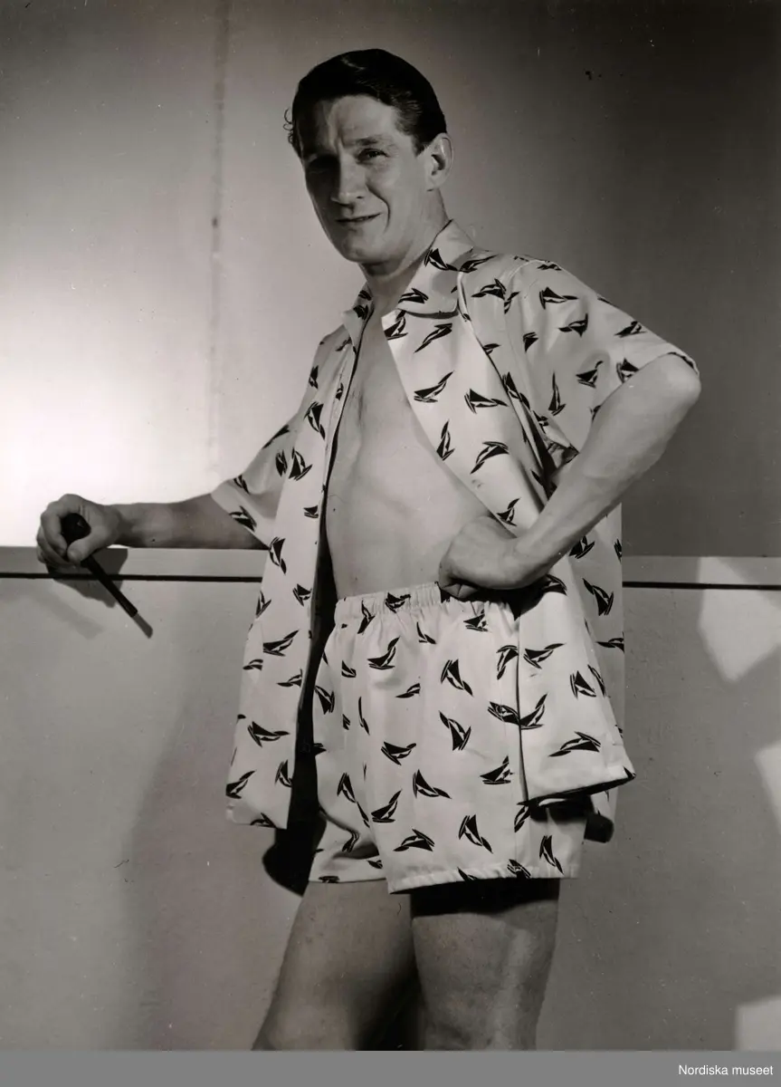 En man visar boxershorts och skjorta (möjligen pyjamas) i samma mönstrade tyg från California - Kläder. I handen håller han en pipa. På varuhuset Nordiska Kompaniet i Stockholm 1947.