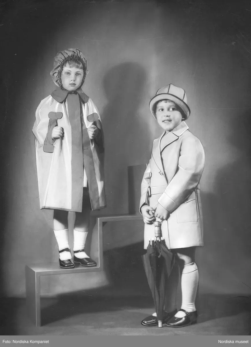Barnkläder. Barnet på golvet klädd i dubbelknäppt kappa, hatt, vita knästrumpor, lackskor och paraply i handen. Barnet på ställning i ärmlös kappa, mössa, vita strumpor och lackskor.